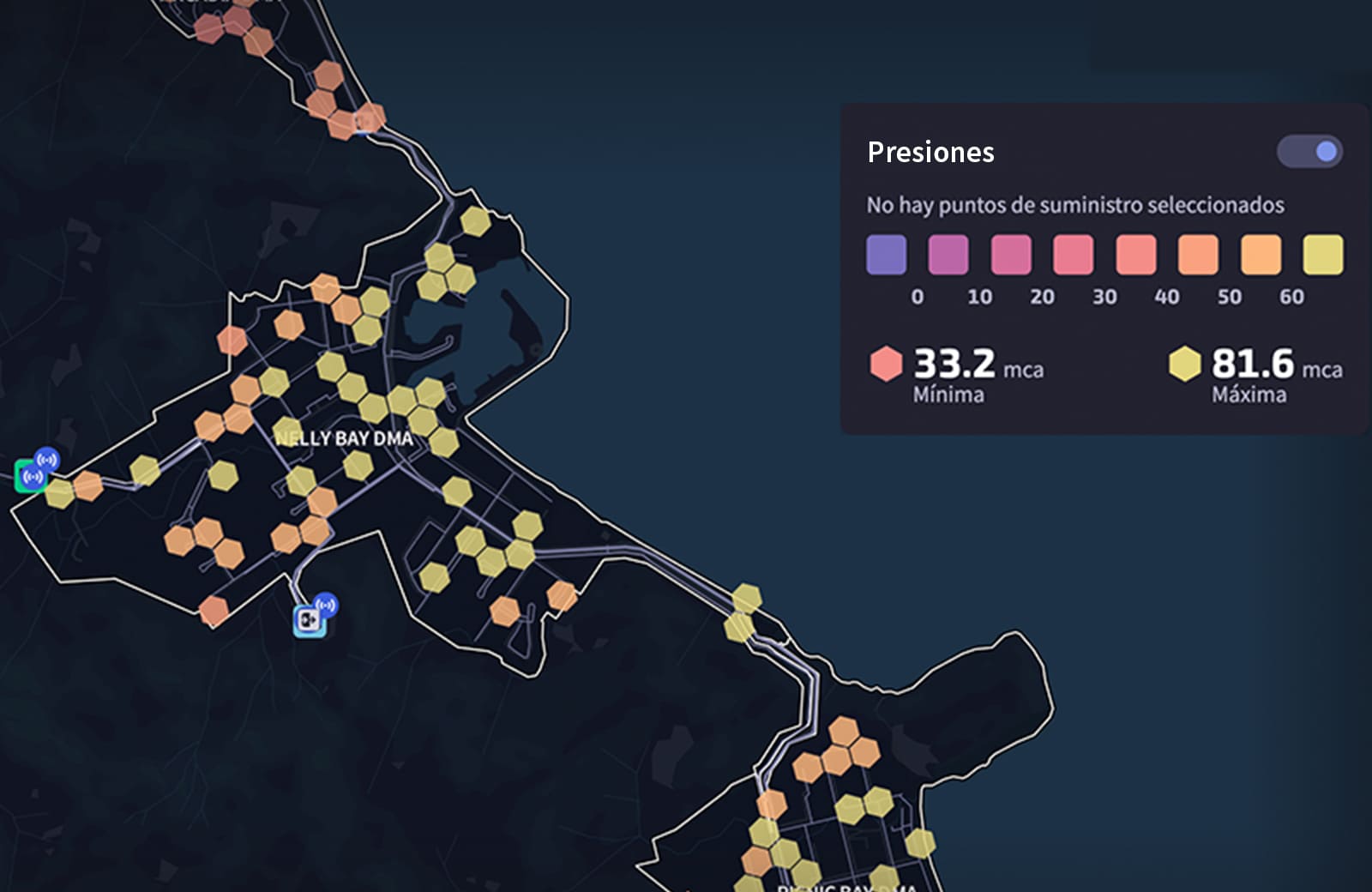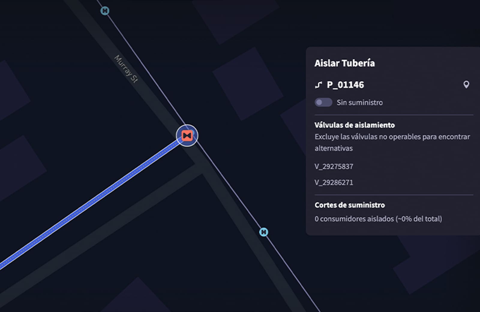 Recibe alertas sobre la presión o el caudal para una supervisión de la red de agua exhaustiva. Identifica cuándo la presión está inusualmente baja en un nudo o los caudales de una tubería son anormalmente altos.